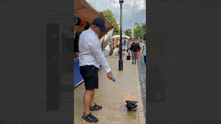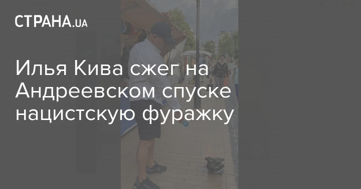 Народный депутат от партии "Оппозиционная платформа - за жизнь" Илья Кива в центре Киева, на Андреевском спуске, сжег фуражку немецких нацистов из сувенирной лавки.