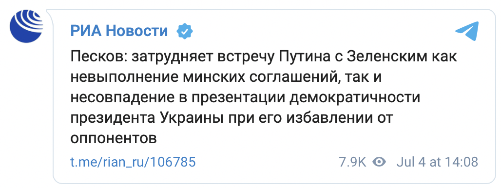 В Кремле заявили, что преследование Зеленским политических оппонентов затрудняет подготовку его встречи с Путиным
