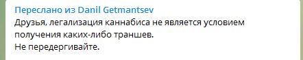 Нардеп от "Слуги народа" Даниил Гетманцев, комментируя слухи, что Офис президента собрал голоса под законодательную инициативу, чтобы получить следующий транш МВФ, написал, что  легализация каннабиса не является условием получения каких-либо траншей.