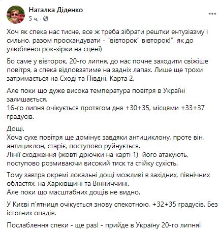 Синоптик Наталья Диденко пишет, что жара в Украине немного спадет с 20 июля. Начнет заходить свежий воздух, который принесет облегчение на западе, севере страны, в Киеве. В следующий вторник в этих регионах днем прогнозируют до +26. При этом жара немного задержится на юге и востоке.