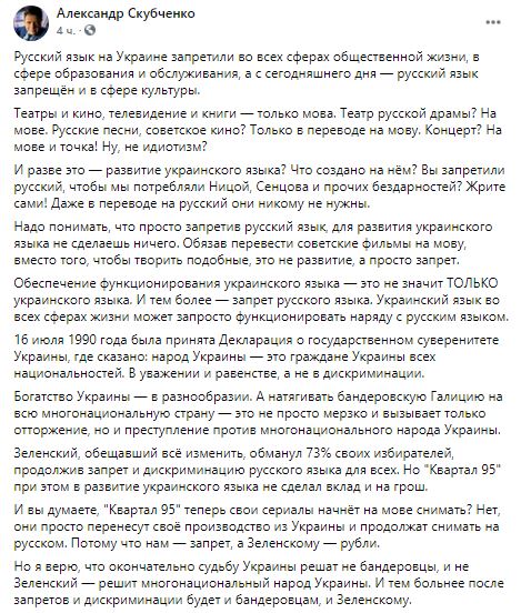 "Русский язык на Украине запретили во всех сферах общественной жизни, в сфере образования и обслуживания, а с сегодняшнего дня — русский язык запрещён и в сфере культуры.