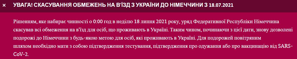 С 18 июля ФРГ открыла въезд для всех граждан Украины. Раньше туда пускали только полностью привитых от коронавируса (прививками, одобренными в ЕС) и тех, кто обосновал исключительные основания для въезда.