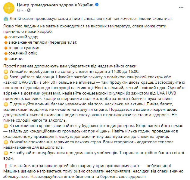 "Помните, что оставлять детей или животных в припаркованном авто - опасно! Машина быстро нагревается, поэтому риск получить неблагоприятные последствия жары значительно увеличивается. Наслаждайтесь летом безопасно и берегите свое здоровье", - добавили в ЦОЗ.