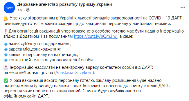Украинским отелям, в случае вакцинации от коронавируса всего персонала, выдадут "знак безопасности" и внесут их в список отелей Государственного агентства развития туризма Украины (ГАРТ).