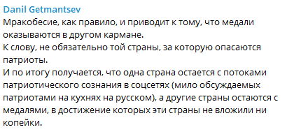 И по итогу получается, что одна страна остается с потоками патриотического сознания в соцсетях (мило обсуждаемых патриотами на кухнях на русском), а другие страны остаются с медалями, в достижение которых эти страны не вложили ни копейки", - написал Гетманцев.