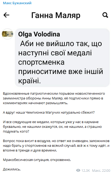 "Вдохновленные патриотическим порывом новоиспеченного замминистра обороны Анны Маляр, её подписчики прямо в комментариях начинают размышлять. А вдруг наша Чемпионка Магучих натурально сбежит? И все следующие ее медали, которые уже у нас в кармане буквально, не нашими окажутся, ох, не нашими, а страшно подумать кого?