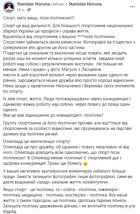 "Спорт, мать вашу, вне политики!!! Спорт – это вид деятельности. Для большинства спортсменов национальной сборной Украины это профессия и дело жизни. Отстаньте от спортсменов с вашей ****ной политикой", - написал Горуна в Facebook