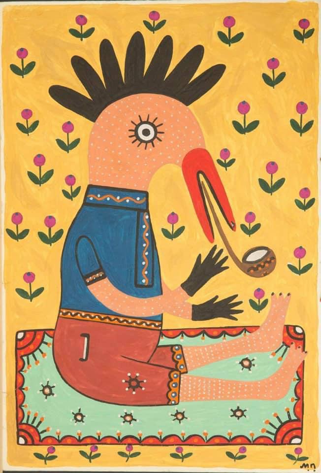 Правда, на самом деле, на ней изображен не петух, а селезень, а картина, написанная в 1987 году, называется "Качур курить у палчатках, щоб не обпалить руки і п'ятки".