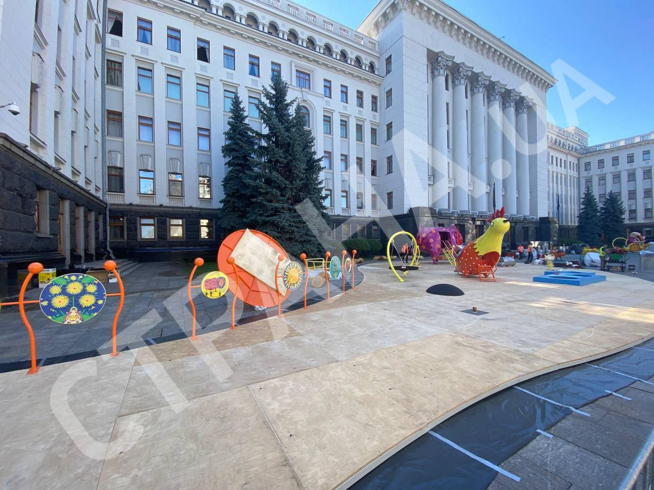 Перед Офисом президента сегодня закончили монтаж игровой площадки с каруселями и качелями. Арт-локацию, созданную по мотивам полотен украинской художницы Марии Примаченко, откроют ко Дню независимости. Она будет бесплатной для всех посетителей.
