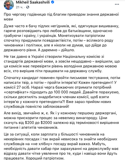 На своей странице в Facebook Саакашвили написал разгромный пост, в котором назвал требование экзаменации на знание украинского языка "очередной кормушкой", новым способом госчиновников "монетизировать патриотизм".