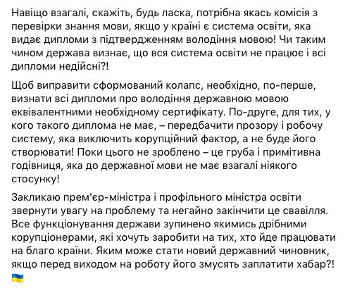 "Про очередную кормушку под благим предлогом знания государственного языка. Очень часто я вижу отпетых негодяев, которые, надев вышиванку, с жаром рассказывают о любви к родине, одновременно грабя и страну, и украинцев. Монетизировать патриотизм сначала придумали псевдоактивисты, потом – всякого рода чиновники и политики, но я никогда не думал, что дойдет до государственного уровня. А зря – дошло.