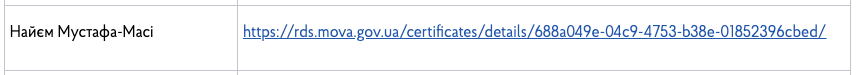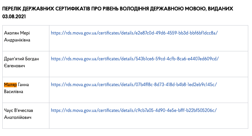 Также прямо накануне назначения сертификаты о знании украинского языка были выданы двум заместителям министра инфраструктуры Мустафе Найему (сдал экзамен на 89%) и Василию Шкуракову (85%). Правда в этом случае их имена оказались среди нескольких десятков других чиновников, прошедших экзаменацию.