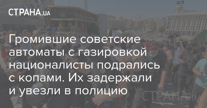 Нескольких националистов из тех, которые громили инсталляцию с советскими автоматами с газировкой в центре Киева, задержали и отвезли на автобусе в Печерское управление полиции.
