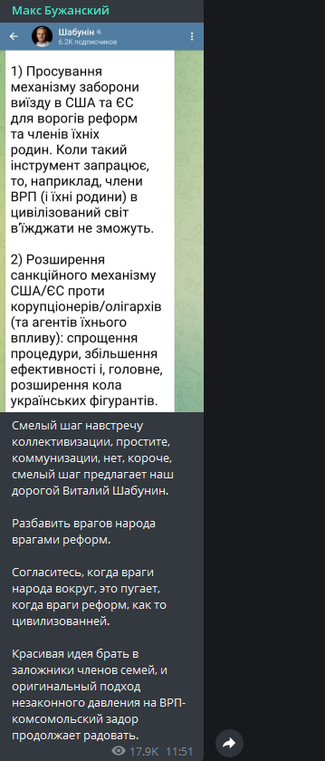 "Продвижение механизма запрета выезда в США и ЕС для врагов реформ и членов их семей. Когда такой инструмент заработает, то, например, члены ВСП (и их семьи) в цивилизованный мир въезжать не смогут", - рассуждает Шабунин.