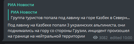 Позже появилось сообщение РИА Новости, согласно которому, пострадавшие в результате схода лавины альпинисты - из Украины. Инцидент произошел на нейтральной территории.