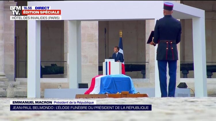Макрон персонально отдал дань уважения актеру. Глава государства в одиночестве подошел к гробу, наклонился и коснулся рукой укрытой национальным флагом крышки.