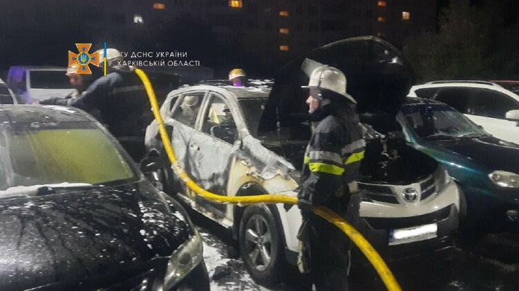 Одна машина сгорела полностью, еще пять - пострадали. Фото: kh.dsns.gov.ua