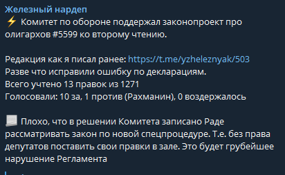 На заседании комитет Рады рекомендовал законопроект об олигархах ко второму чтению. При этом, по словам Ярослава Железняка, было учтено всего 13 правок из 1271. За документ проголосовали 10 членов комитета, Сергей Рахманин проголосовал против. Таким образом, документ далее передадут в Раду для рассмотрения его во втором чтении.