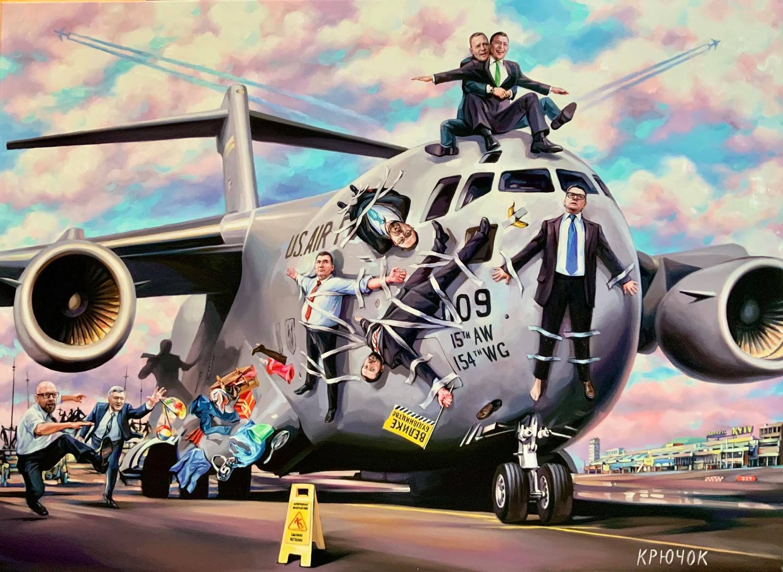Заместитель главного редактора "Страны" Светлана Крюкова выставила на аукцион очередную картину, на которой вполне узнаваемые украинские политики бегут из страны, "оседлав" всеми возможными способами американский военный самолет. Таким образом автор проводит аналогию с недавними событиями в оставленном американцами Афганистане, когда многие пытались сбежать из страны, ухватившись за военно-транспортный самолет США.
