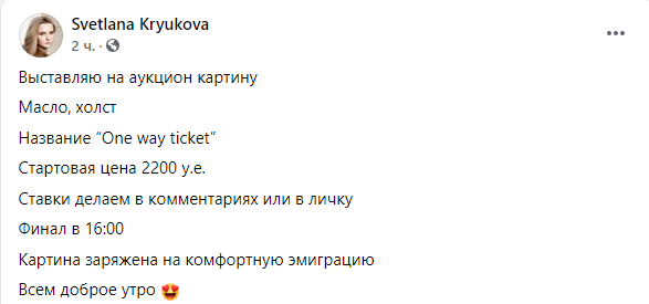 "Выставляю на аукцион картину. Масло, холст. Название "One way ticket". Стартовая цена 2200 у.е. Ставки делаем в комментариях или в личку", - говорится в сообщении.