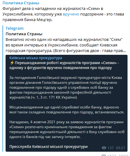 Напомним, 4 октября на журналистов программы "Схемы" в ходе интервью с председателем правления "Укрэксимбанка" Евгением Мецгером напали прямо в его кабинете. У журналистов отобрали силой две камеры, и вернули через час без записей.