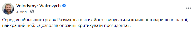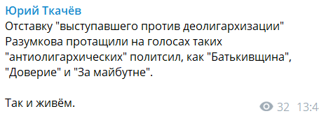 13:45  "Отставку "выступавшего против деолигархизации" Разумкова протащили на голосах таких "антиолигархических" политсил, как "Батькивщина", "Доверие" и "За майбутне"", - пишет журналист Юрий Ткачев.