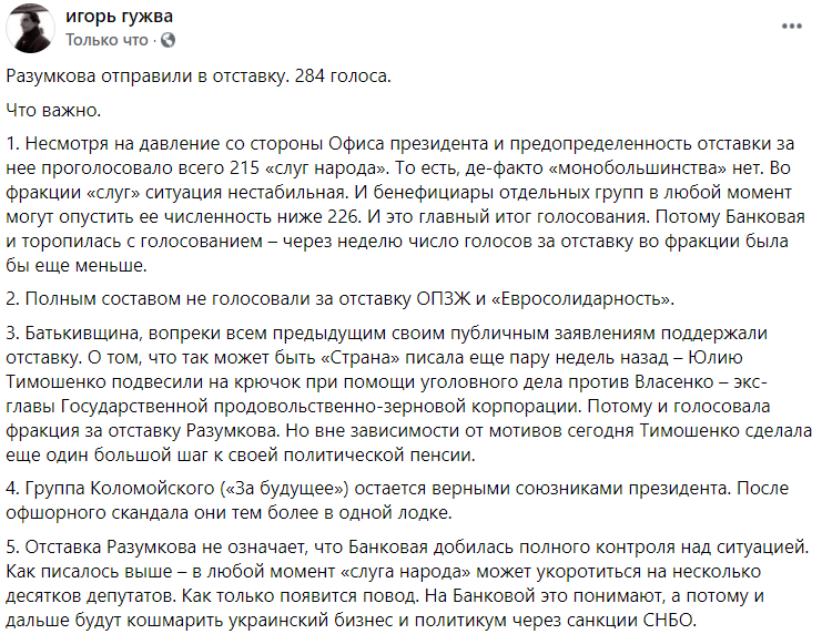 1. Несмотря на давление со стороны Офиса президента и предопределенность отставки за нее проголосовало всего 215 "слуг народа". То есть, де-факто "монобольшинства" нет. Во фракции "слуг" ситуация нестабильная. И бенефициары отдельных групп в любой момент могут опустить ее численность ниже 226. И это главный итог голосования. Потому Банковая и торопилась с голосованием – через неделю число голосов за отставку во фракции была бы еще меньше.