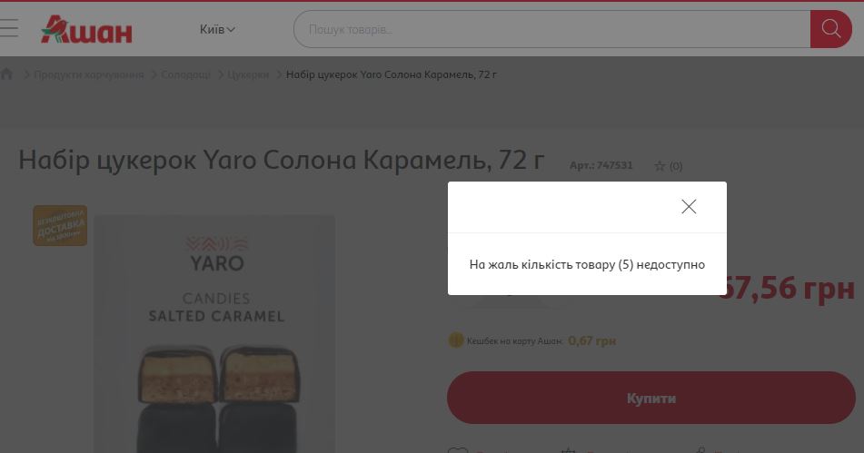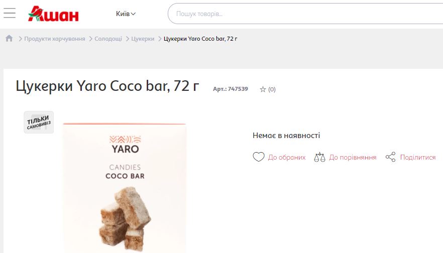 На сайте "Ашана" при выборе товаров ТМ Yaro появляется надпись "недоступно к заказу" либо "нет в наличии".
