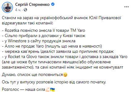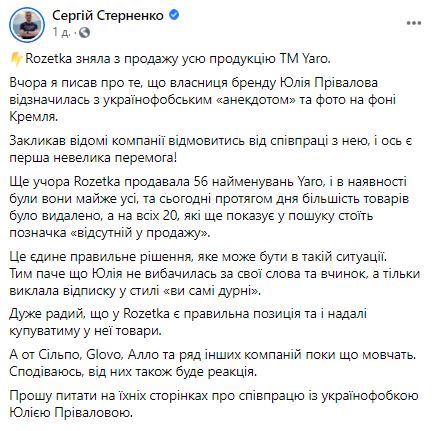"Есть первая небольшая победа! Еще вчера Rozetka продавала 56 наименований Yaro, и в наличии они были почти все, и сегодня в течение дня большинство товаров были удалены, а на всех 20, которые еще показывает в поиске, стоит пометка "отсутствует в продаже"... А вот Сильпо, Glovo, Алло и ряд других компаний пока молчат. Надеюсь, от них также будет реакция" - написал Стерненко и призвал оставлять на их страницах комментарии и спрашивать "о сотрудничестве с украинофобкой Юлией Приваловой".