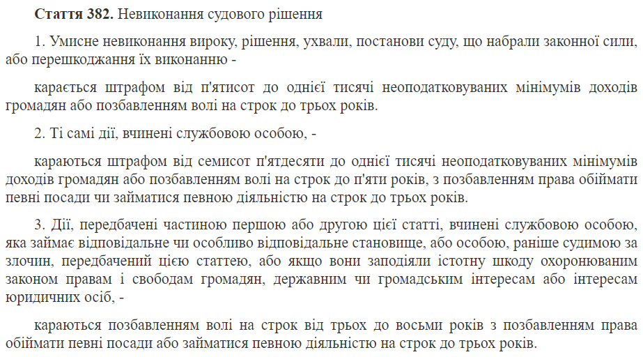 Но если отвлечься от лирики, то неисполнение решения суда, совершенное умышленно, карается по 382 статье уголовного кодекса. Для должностных лиц предусмотрена усиленная ответственность: от штрафа до пяти лет заключения.