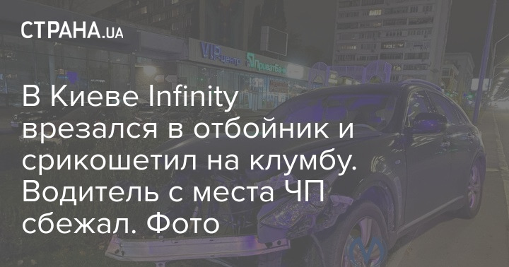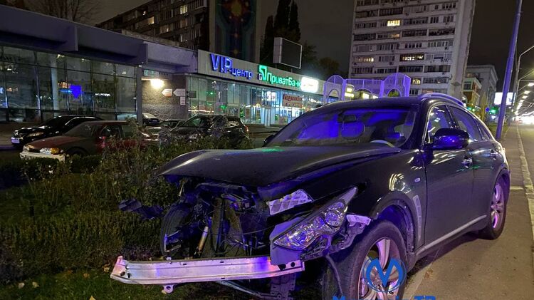 В ночь на понедельник, 25 октября, в Киеве автомобиль Infinity врезался в отбойник и вылетел в зеленую зону. После происшествия водитель и пассажиры авто поспешно уехали с места происшествия.