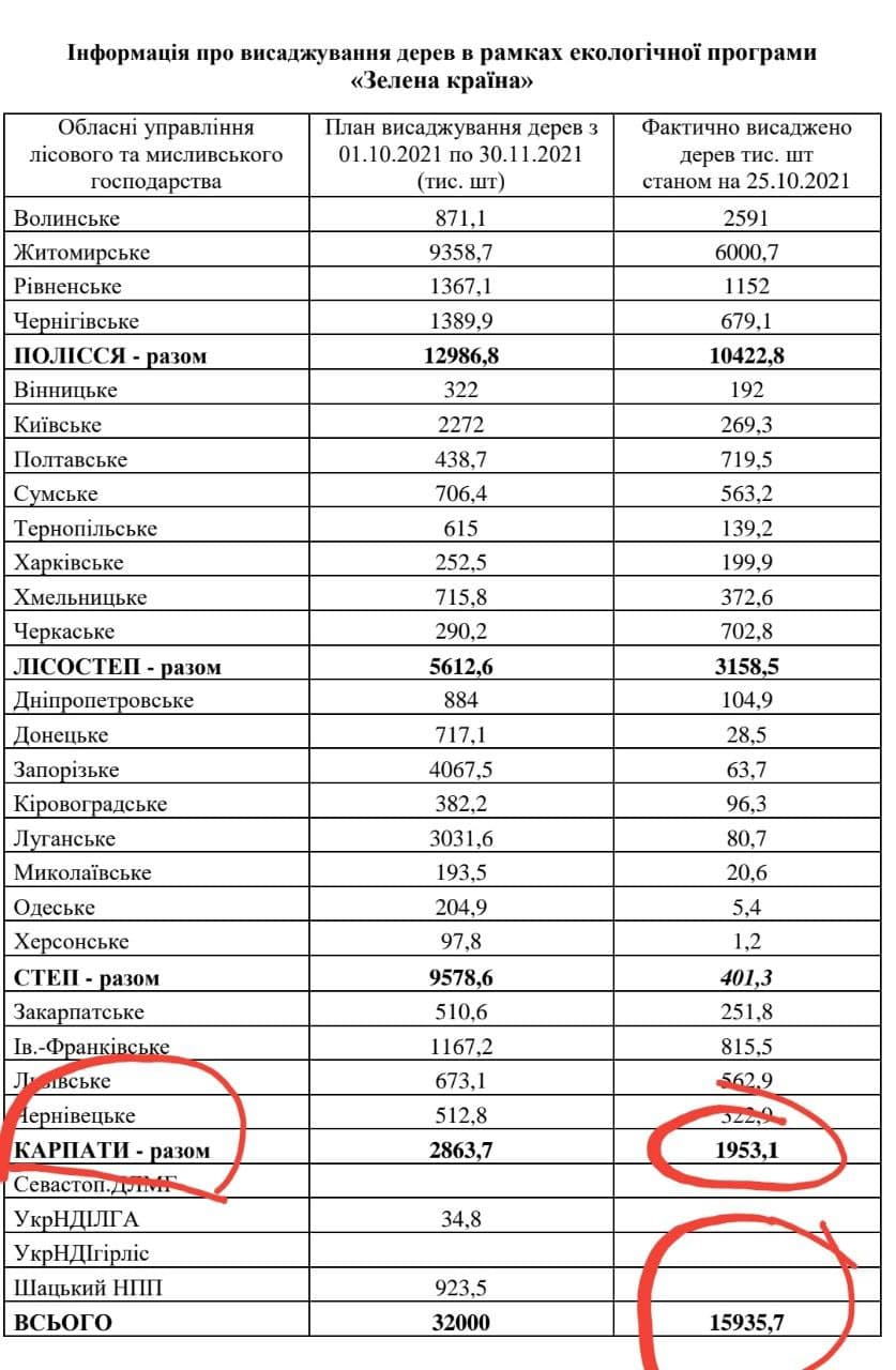 "За 5 месяцев удалось выполнить план на 1,6% - посадить почти 16 млн деревьев. В основном в лесистом Полесье. А вот пострадавшим от незаконной вырубки Карпатам досталось лишь 2 млн саженцев. Со следующего года гослесагентство обещает увеличить темпы высадки в 10 раз до 300 млн деревьев в год", - говорится в сообщении.