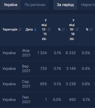 По данным системы СНБО, первых двух несовершеннолетних в возрасте от 16 до 18 лет привили в апреле в Черновицкой области. В июле впервые привили подростка в возрасте от 12 до 15 лет - в Черкасской области. С тех пор показатели по вакцинации несовершеннолетних растут.