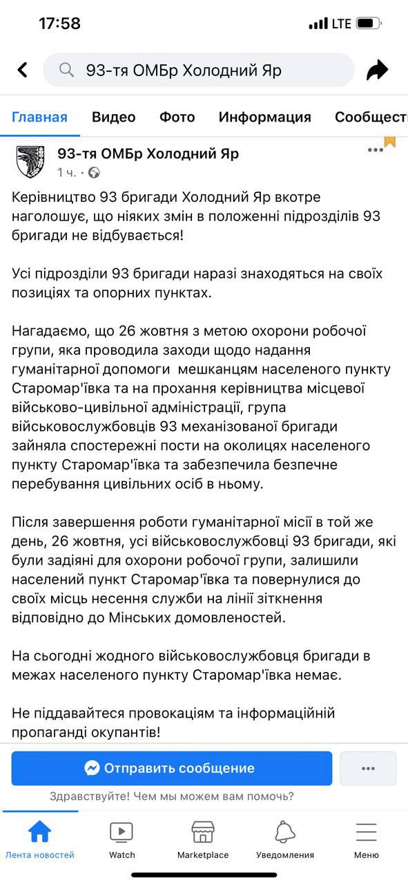 93-я Бригада "Холодний Яр" опровергла информацию, что она до сих пор удерживает поселок Старомарьевка