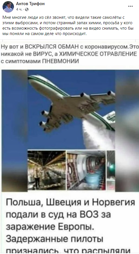 Отметим, опубликованная Антовым информация - фейк. Она относится к популярной теории заговора о "химтрейлах", которая появилась в середине 90-х годов. Ее приверженцы считают, что военные распыляют с самолетов химикаты, которые вызывают всевозможные болезни. Коронавирус также попал в этот список.