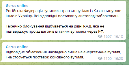 "Все соответствующие поставки в ноябре заблокированы", - написал Герус и уточнил, что речь только об энергетическом угле, и не касается коксующегося угля.
