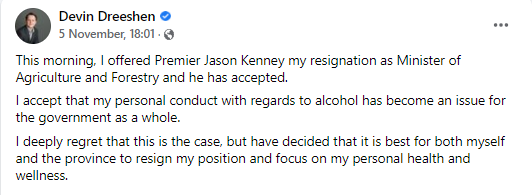В Канаде министр лесной промышленности и сельского хозяйства провинции Альберта Девин Дришен ушел в отставку после обвинений в распитии алкоголя в своем рабочем кабинете. Впервые о пьянстве Дришена стало известно 10 дней назад после того, как его бывшая подчиненная подала иск в суд, в котором описывалась "отравленная рабочая атмосфера".