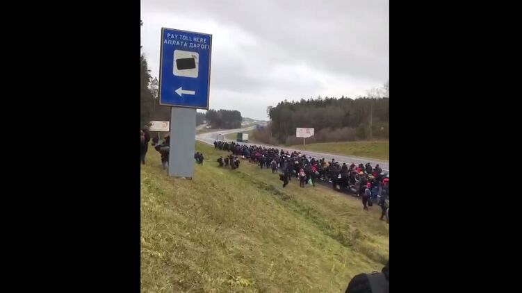 В понедельник, 8 ноября, огромная колонна беженцев идет вдоль трассы по территории Беларуси к границе с Польшей, которая в ближайшее время планирует построить пятиметровый стальной забор для защиты от нелегальных мигрантов.