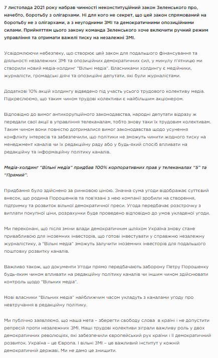 "Правда, непонятно - а зачем это сделано? Так как из под действия закона Петра Порошенко это все равно не выведет, потому что в законе есть пункт о "значительном влиянии на медиа". И хотя Порошенко заявил, что уже подписано соглашение о невмешательстве владельцев в работу "Свободных медиа", в СНБО наверняка на эту бумагу никакого внимания не обратят и введут Порошенко в реестр олигархов с песнями и плясками", - говорится в телеграм-канале.