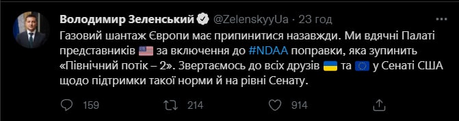 Так, Зеленский поблагодарил членов Палаты представителей США за поддержку поправки к оборонному бюджету, "которая остановит "Северный поток - 2".