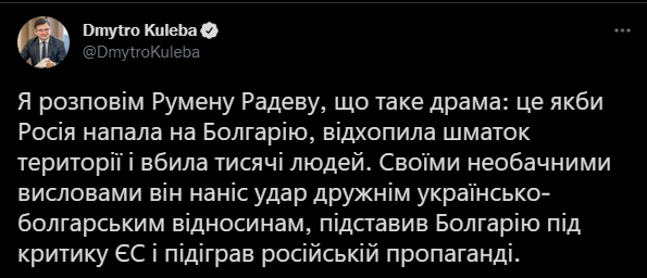 Что касается "настоящей драмы", то Дмитрий Кулеба описал для Румена Радева сценарий, при котором Россия нападает на Болгарию, отхватывает кусок территории и убивает тысячи людей.