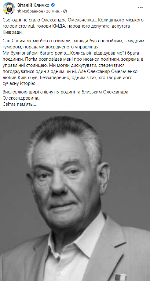 "От нас навсегда ушел Александр Омельченко. Светлая память легендарному человеку и профессионалу. Он был достойным руководителем Киева!