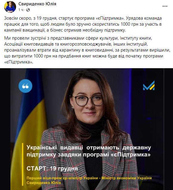 "Совсем скоро, с 19 декабря, стартует программа "естьПоддержка". Правительственная команда работает для того, чтобы людям было удобно воспользоваться 1000 грн за участие в кампании вакцинации, а бизнес получил необходимую поддержку", - говорится в сообщении.