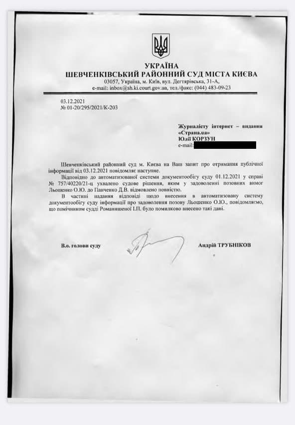 Правда, на сайте судебного реестра Украины вчера появилась запись, что суд удовлетворил иск Льошенко.