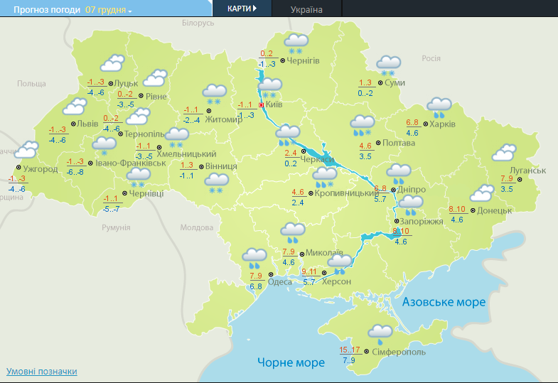 "Временами дождь и мокрый снег, местами налипание мокрого снега, на дорогах гололедица; на юге и в центральных областях дождь, местами туман. Температура в западной части ночью и днем около 0 градусов, в Карпатах -2...-8 градусов мороза. В северных областях постепенное повышение температуры ночью и днем до +1...+5 градусов тепла, на остальной территории ночью +3...+8 градусов тепла, днем до +6...+12 градусов, на юге местами до +16 градусов", — сообщили в Укргидрометцентре.
