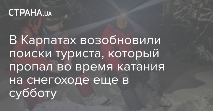 На Закарпатье вторые сутки продолжаются поиски туриста, который в субботу вечером потерялся в горах во время катания на снегоходах. В возобновленных в понедельник в 05:00 поисках участвуют три десятка спасателей, семь единиц техники и пять волонтеров.
