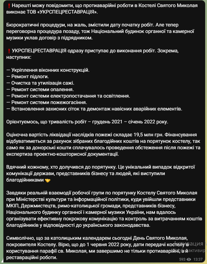 "Наконец-то могу сообщить, что противоаварийные работы в Костеле Святого Николая выполнит ООО "УКРСПЕЦРЕСТАВРАЦИЯ". Бюрократические процедуры, к сожалению, сместили дату начала работ. Но теперь переговорная процедура позади, поэтому Национальный дом органной и камерной музыки заключил договор с подрядчиком", - написал Ткаченко.
