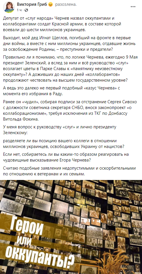Внефракционный депутат Виктория Гриб недоумевает тому, что в эфире украинского телеканала заявил Чернев, и интересуется, является ли ее погибший дед и еще миллионы украинцев, отдавшие жизнь за освобождение своей Родины предателями?