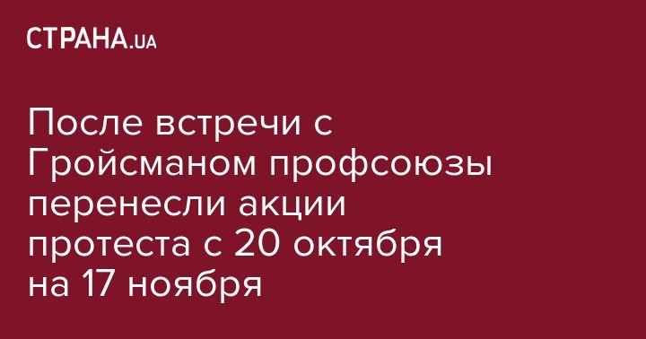 Премьер-министра Украины Владимир Гройсмана во вторник за закрытыми дверями встретился с руководителями украинских профсоюзов, которые намечали проведение массовой акции протеста на 20 октября. По итогам встречи, председатель Федерации профсоюзов Украины Григорий Осовой заявил, что профсоюзы согласились перенести свою акцию, чтобы дать правительству время разработать план выполнения их требований, сообщает корреспондент "Страны".
