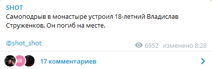 По данным телеграм-канала SHOT, взрыв в монастыре устроил 18-летний Владислав Струженков. Он погиб на месте. По другим данным, злоумышленник госпитализирован с тяжелыми ранами. Парень ранее был воспитанником православной гимназии.